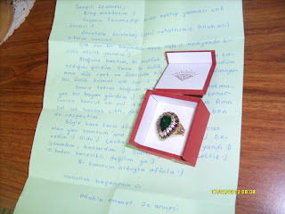 Aslında pazartesi elime geçti hediyem ama bilgisayarda oluşan problemler nedeniyle yazamadım..Değmesinyağlıboya bloğu olan arkadaşımın düzenlediği hediyeleşme etkinliğine katılmıştım ve sevgili Sümeyye ile eşleşmiştim..Sağolsun bana kendi elleriyle yaptığı bu güzel yüzüğü göndermiş buradan da kendisine çok teşekkür ediyorum..